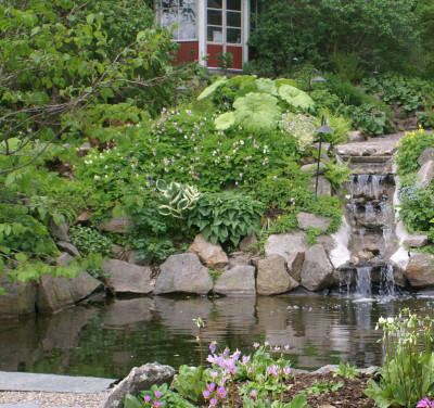 Den ursprungliga utformning medgräsmattor, några få rabatter och två fruktträd är ersatt med ett flertal trädgårdsrum, många sittplatser, ett par dammar, ett lusthus och ett växthus. Grund tanken med växtligheten är att skapa en livfull grön bas, då varje växts blomningstid är ganska kort. Vi jobbar därför med bladens storlek, nyans och struktur, och blandar det gröna med röd- och gulbladigt för att få kontraster.