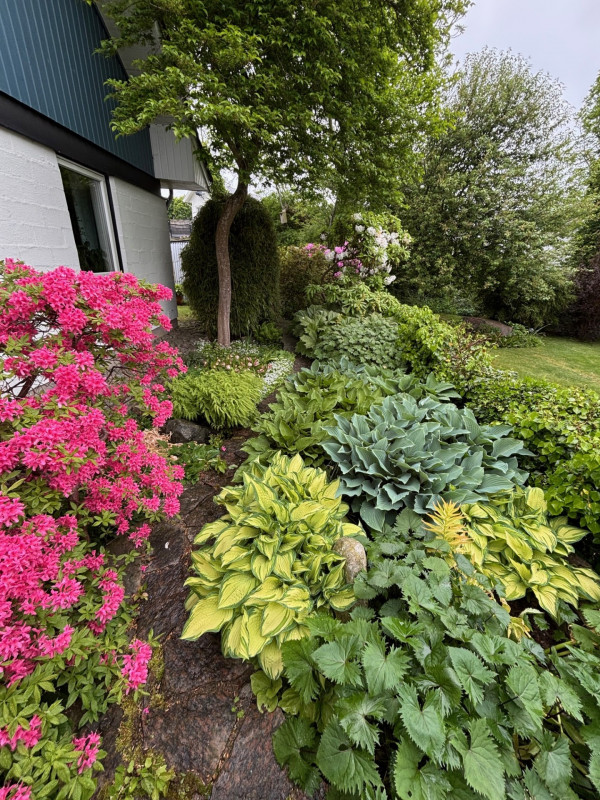 Vi har en ganska liten villaträdgård med stort innehåll.Trädgården började anläggas för drygt trettio år sedan. Här finns drygt 80 rhododendronarter och hybrider,